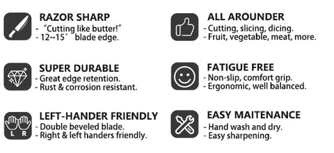 Set Includes: 1pc 8 Inch Chef Knife, 1pc 5 Inch Santoku Knife, 1pc 3.5 Inch Paring Knife, 1pc 7 Inch Nakiri Knife, 1pc Kitchen Shears, 1pc Wooden Knife Block
